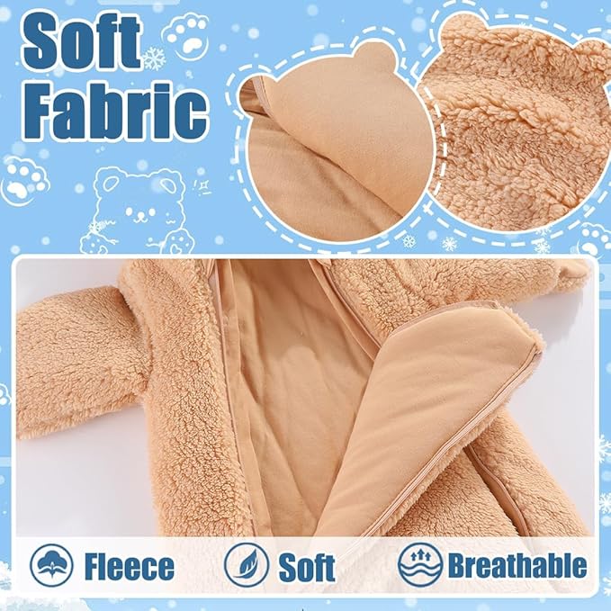 • 🐻【Warm Design】 The infant winter thick fleece hoodie footie one-piece design, the baby's head and ears can be wrapped. Baby winter snowsuit with hands and foot wrap, which keep baby's hands and feet warm when going out, perfect for cold winter.