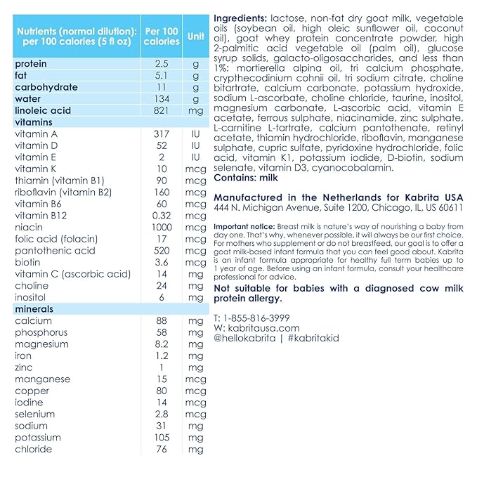 • CLEAN & SAFE EUROPEAN FORMULA MEETS FDA REQUIREMENTS: Kabrita is the first and only goat milk formula to meet all rigorous FDA requirements & strict European safety standards. Our baby formula is made with no GMOs, growth hormones, corn syrup, or anti-biotics.