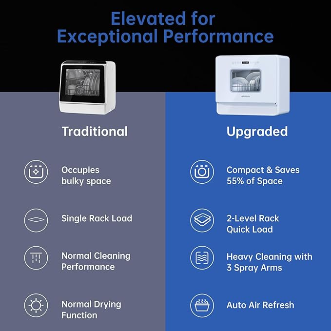 • Sleek Design & High Capacity: A01 countertop dishwasher features a slim profile, saving valuable countertop space. Ideal for small kitchens and families (5-6 people), it can accommodate plates up to 11.8 inches in diameter when the upper basket is removed.