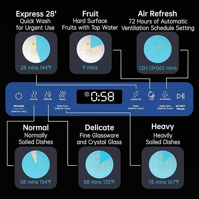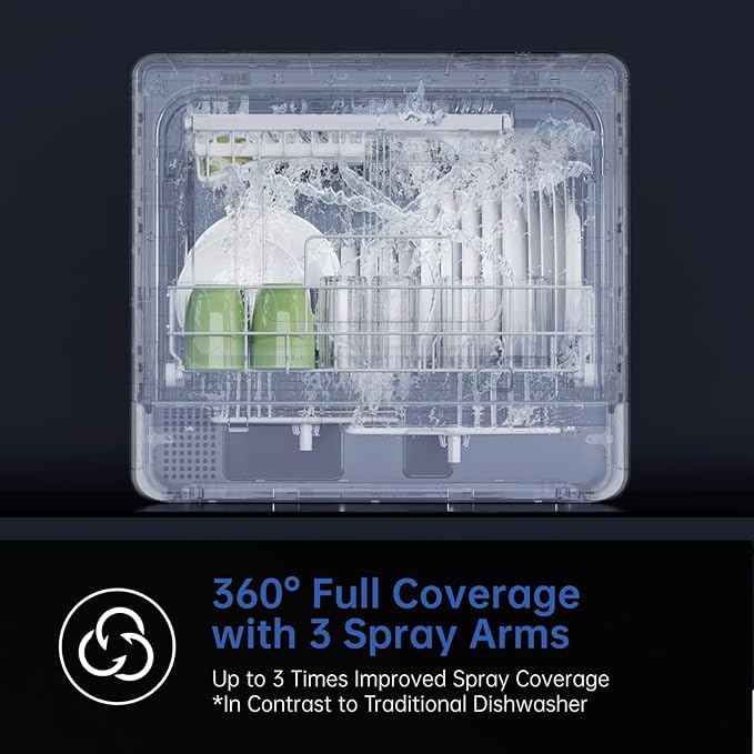 • High-Temperature Cleaning: The mini dishwasher includes a Hygiene Cycle that heats water to 167°F, sanitizing dishes (even baby bottles) and removing tough stains. It also provides 60 minutes of hot-air drying and 72-hour automatic ventilation to keep dishes and the interior dry and fresh long-term.