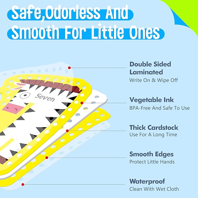 • Premium Material: The lacing cards are made of sturdy cardstock, durable and handy. Double side printed with premium plant ink, non-toxic and no odd smell, safe enough for toddlersโ€™ use. The laces are made of quality polyester, which is not simple to break, and can serve you for a long time.