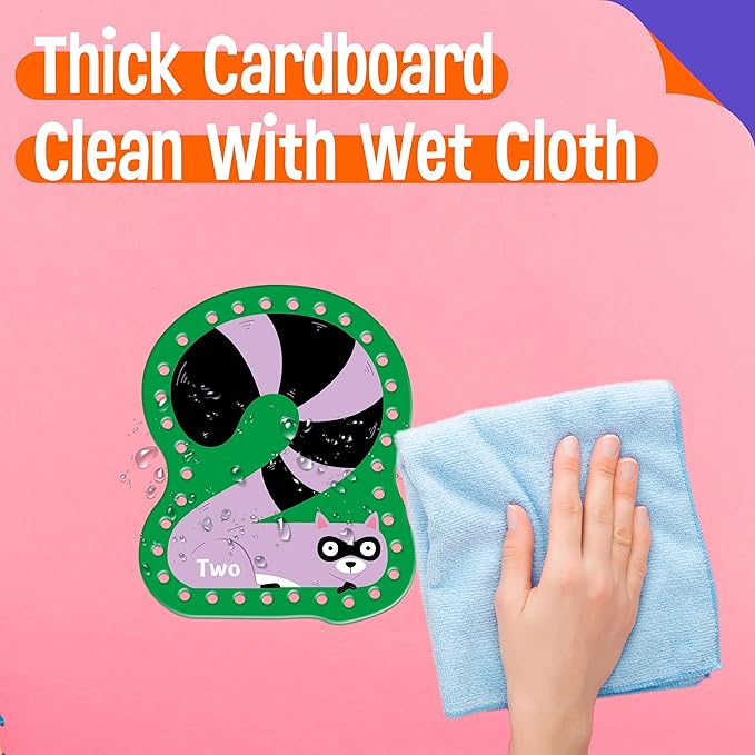• Double-sided Printing: One side of the card is an adorable animal in a number-shape, another side is the corresponding amount of this number (Especially explained the concept of zero). The patterns on cards are colorful, big and vibrant. The holes are clearly cut and easy for preschoolers to work with. The strings are easy for children to use and fit into the holes easily.