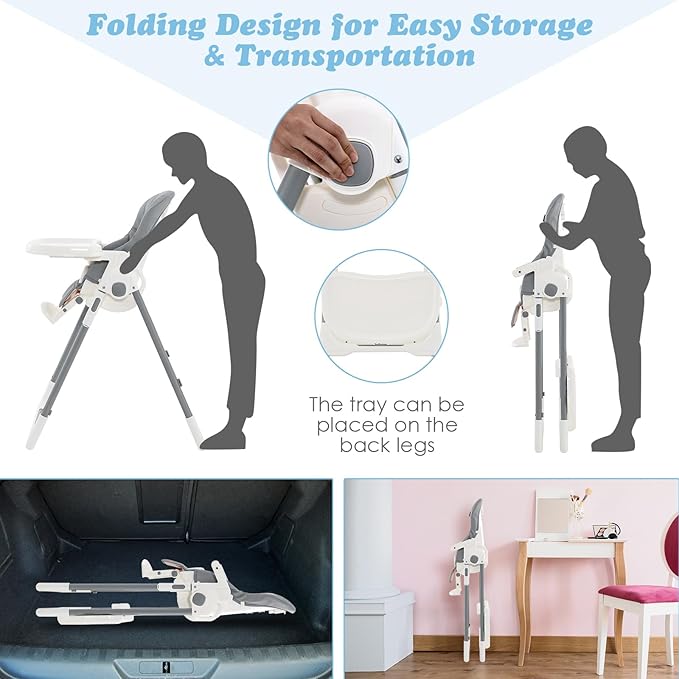 • Easy Use Clean Fold: The highchairs requires no installation. Removable BPA-free plastic trays that are dishwasher safe. Also has a removable waterproof PU leather cushion that can be wiped off with a clean cloth. What's more, the foldable high chairs not only folds up effortlessly in 5 seconds when not in use, but also stands up freely after folding. Compact folding size suitable for storage in any corner.