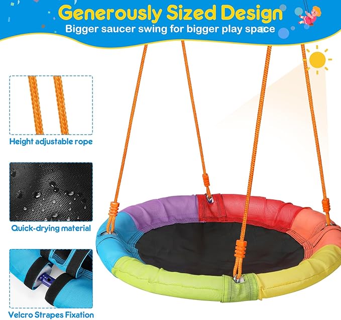 • Solid Frame and Sturdy Fabric:Our swing set features a strong metal A-frame, ensuring stability and safety with a 440 lbs weight capacity. The saucer swing boasts a resilient Teslin fabric seat, while the swing seat is made of non-slip polymer plastic