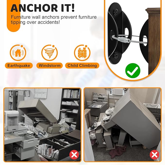 • EARTHQUAKE RESISTANT - Tall pieces of furniture like bookcases are easy to fall when the ground is rolling and shaking. You can prevent the furniture from falling on someone you care about by using these furniture wall anchors. The metal anchors work even in households without children - some data indicate that adults are also injured by furniture tip-overs.
