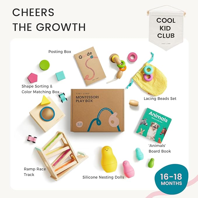 Tiny Land Montessori Toy Set for Baby 16-18 Months Adventure Play Kit - 7-in-1 Ramp Race Track, Shape Sorting and Color Matching Box, Lacing Beads Set, Silicone Nesting Dolls, Animals Board Book