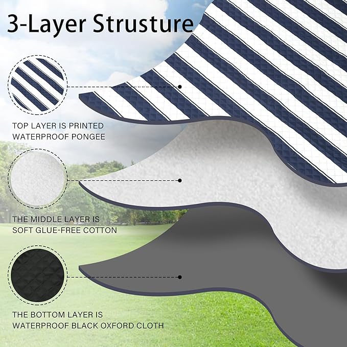 • 【Soft and Durable with 3-Layers】The picnic blanket top layer is printed waterproof pongee, the middle layer is soft glue-free cotton, and the bottom layer is waterproof black Oxford cloth. Perfectly suitable for siting or lying on grass, beach, floor or any kindly of surface, giving you soft and comfortable feelings.