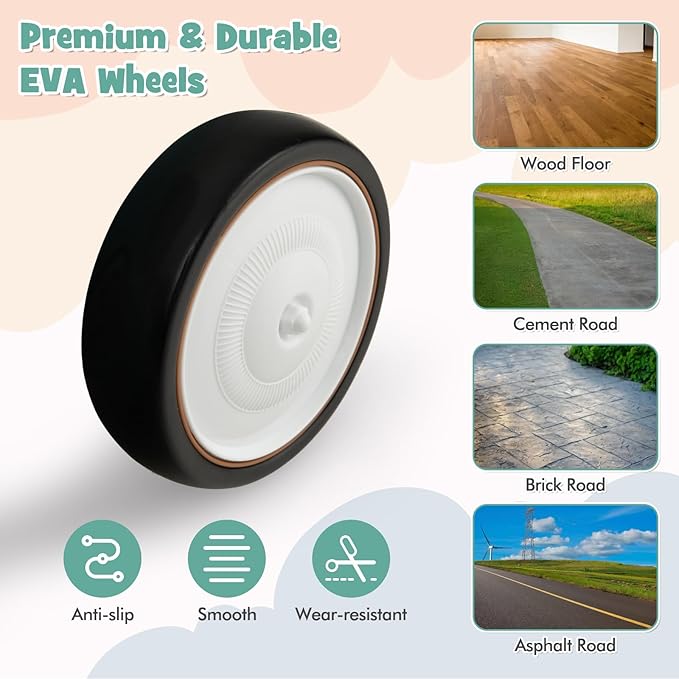 • 【Premium & Durable Wheels】Equipped with 4 all-terrain EVA wheels, the baby push walker offer superior performance. The wheels are anti-slip, wear-resistant, and shock-absorbent, ensuring smooth and safe rides on different types of surfaces such as wood floor, cement road, brick road and asphalt road.