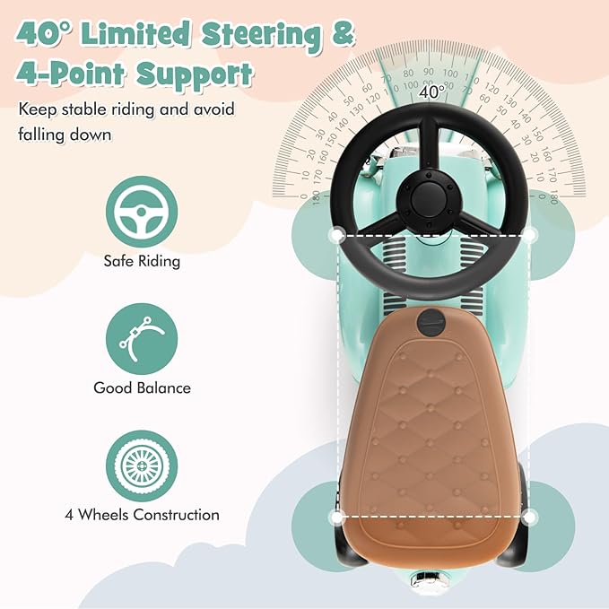 • 【40° Limited Steering & 4-Point Support】This HONEY JOY baby ride on toy comes with a 40° limited steering which helps to keep stable riding and avoid falling down. Besides, the 4 wheels construction ensures good balance and safe riding.