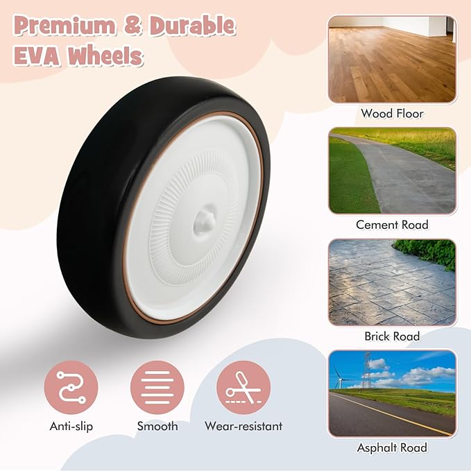 • 【Premium & Durable Wheels】Equipped with 4 all-terrain EVA wheels, the baby push walker offer superior performance. The wheels are anti-slip, wear-resistant, and shock-absorbent, ensuring smooth and safe rides on different types of surfaces such as wood floor, cement road, brick road and asphalt road.
