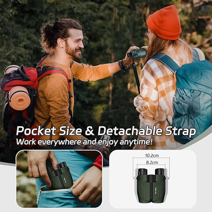 • [Ergonomic Design]Designed with ergonomics in mind, the compact binoculars has a size that fits comfortably in your hand. It features a rubber anti-slip strip on the front for shock absorption and slip resistance, while the back has a groove for your thumb to grip easily. It comes with a storage bag that can be attached to a belt and a wider and stronger neck strap, reducing the burden when wearing, and there is no need to worry about the strap breaking easily.