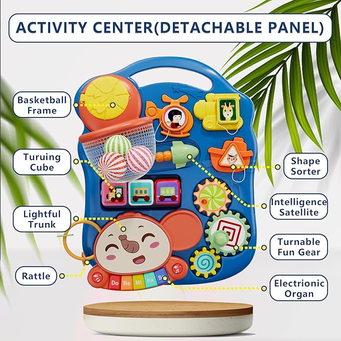 • [Detachable Entertainment Table]: This removable play panel features 3 shape recognition blocks, 3 colorful spinning rollers, 5 piano keys, 1 mobile phone toy, butterfly music button with 8 songs, this new design panel is very useful to help baby recognize colors and shapes, developing sense of rhythm, encouraging your babyโ€™s creativity.