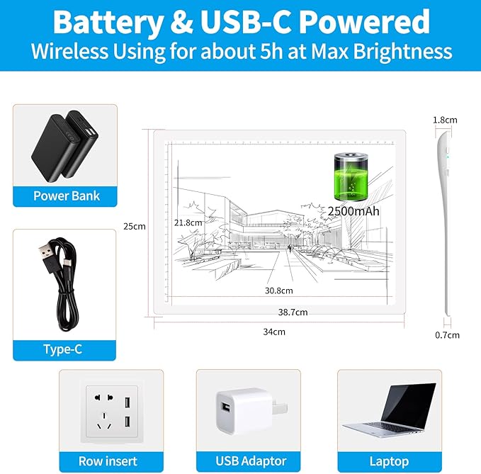 • 【 Built-in Battery and USB-C Powered 】 Our LED lightbox comes with a internal battery which allows you to use it any where without any power source, which makes your project more convenient as well as more enjoyable! Works for around 5 hours after charged 1.5 hours at a time. This A4 lightpad uses a USB-C interface to easily access any USB port, such as a USB wall charger, computer, laptop or mobile power bank. Also,the USB-C interface is more stable than the Micro interface.