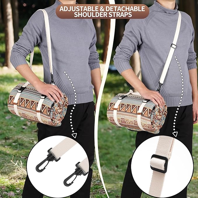• ADJUSTABLE SHOULDER STRAPS - The portable picnic blanket can be carried easily by hand, on either shoulder by adjusting to the proper lengths, so you can carry other picnic suppliers with the other hand,the handle strap with double ring buckle is convenient to carry, and can easily fold and fix the picnic mat,so if you don't fold it exactly as originally packed, it will fit anyway,saving a lot of space on the travel.