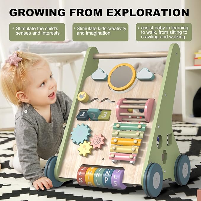 • 🌟【Engaging Multi-Activity Center】Spark curiosity with this baby walker push toy! Doubling as a vibrant activity walker, it features a xylophone, mirror, shape puzzles, bead maze, and spinning gears. As a premier walking toy for infants 6-12 months, its rainbow colors stimulate senses while developing motor skills. The ultimate activity walker for baby 6-12 months and engaging walker toy!