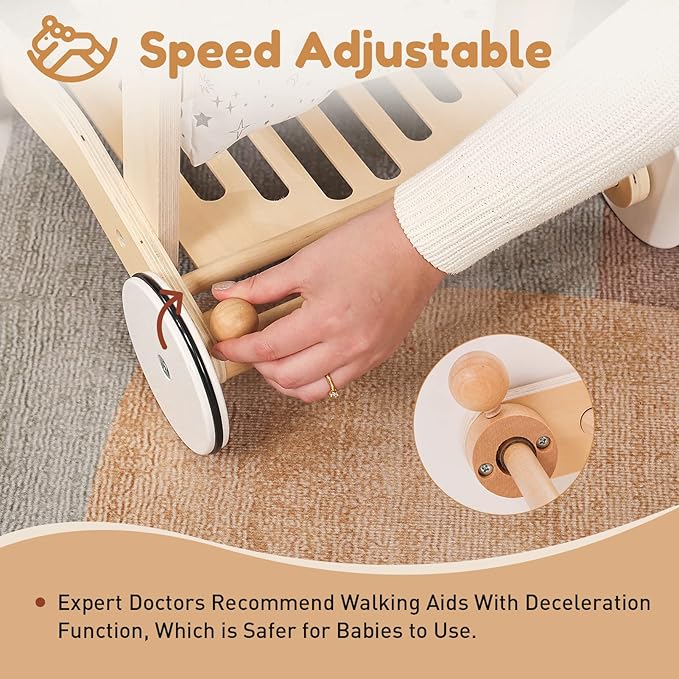 • SPEED ADJUSTMENT - Our unique wooden baby walker design with speed adjustment, parents only need a simple rotary adjuster to control the speed so as not to hurt the baby for too fast speed. Appropriate speed of the baby push walker can also allow toddlers to learn to walk correctly. Expert doctors recommend walking aids with deceleration function, which makes baby learning to walk easier and safer