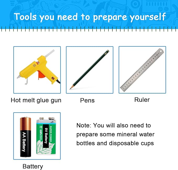 • Pay attention:Suggest to read the instruction manual in detail for assembly๏ผŒPlease control the usage time, use time should not exceed 5 minutes each time, to avoid short circuits. When your project is completed or unattended, it is recommended that you turn off the switch, remove the battery, and store it properly.Tools for super glue or hot melt adhesive for bonding are not included in the kits. Be careful of scald caused by short circuits. The kids must use it under the supervision of adults