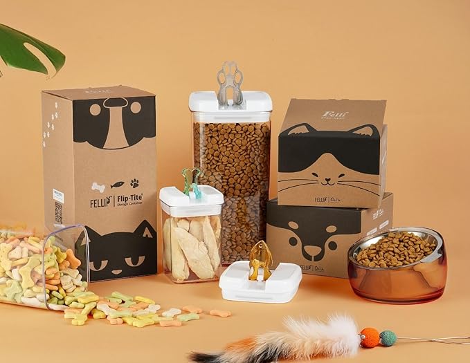 • FUN PAW FISH BONE SHAPED HANDLE: Designed with pet lovers in mind, this container features a patented easy flip top mechanism that makes the lids sturdy and smooth to operate. The unique paw-shaped handles add a playful touch while allowing for easy one-handed opening and closing. It's a stylish and functional addition to any pet owner's kitchen or pantry.