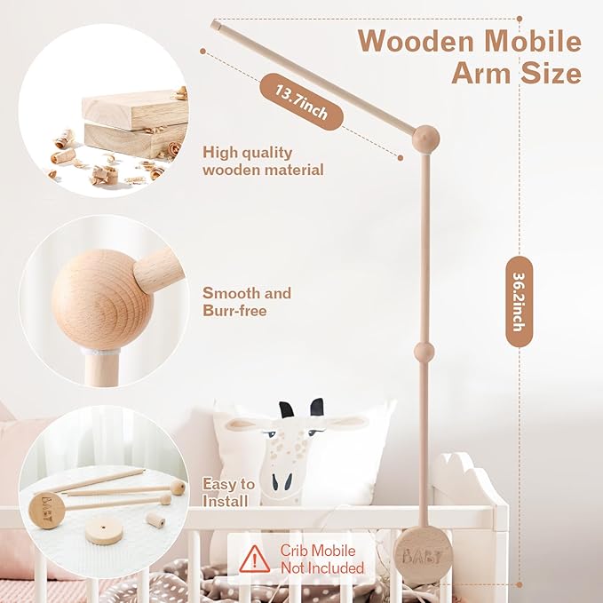 • 👶🏻【Safe Material】JETM·HH baby mobile arm is made of 100% natural beech wood, which is non-toxic and burr-free. The smooth surface can protect the baby's soft and fragile skin. The mobile device of the crib has an anti-slip design and is enlarged. The design can better adapt to various cribs and be more firmly fixed on the crib