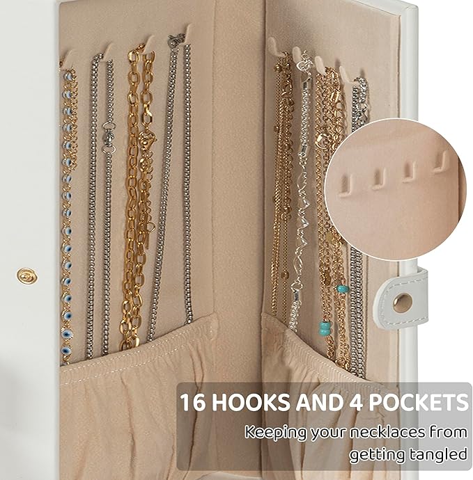 • 【6 LAYERS with 5 Versatile Pull Out Drawers & 2 Hidden Side Cabinets】 The two deeper bottoms of the 5 removable drawers has only one compartment; Drawer 1 has 12 equal size slots; Drawer 2 has 8 equal size slots; Drawer 3 has 4 equal size slots. The 2 Swing out Cabinets including 6 hooks and 2 pockets, help to keep your necklaces from getting tangled