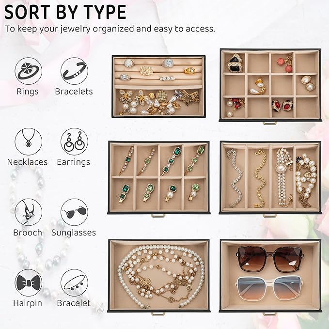 • 【PERFECT CAPACITY,JUST TOP LAYER CAN BE LOCKABLE】:With 6 versatile pull out drawers, this black jewelry box can store jewelry accessories, such as rings, earrings, necklaces, chains, bracelets, and so on. One deeper drawer is designed for large jewelries. For privacy,there have a key to lock the top layer