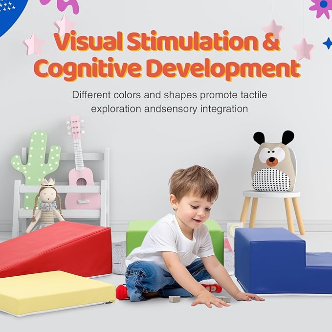 • 4 PIECE SET: A square, a slide, a fan, and a stairs all cover with leather make up our foam play gym set. Different shapes stimulate toddlers' visual development and imagination, allowing them to stack and combine freely