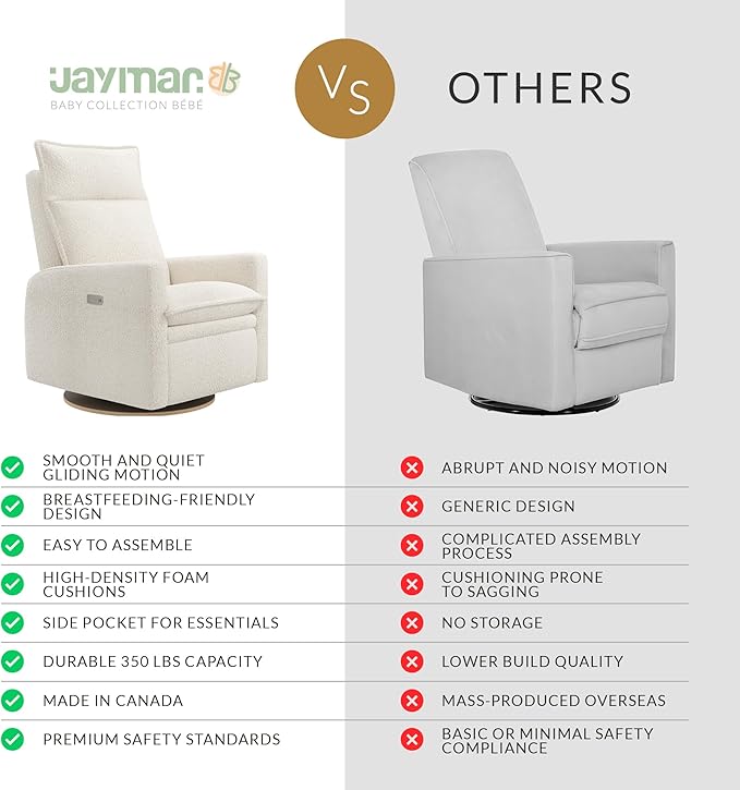 • DURABLE AND SAFE DESIGN: Made in Canada, this compact gliding chair (29.75" W x 34.75" D x 42.5" H) is built with anti-sag springs and a solid wood frame that supports up to 350 lbs, meeting strict Canadian and US safety standards