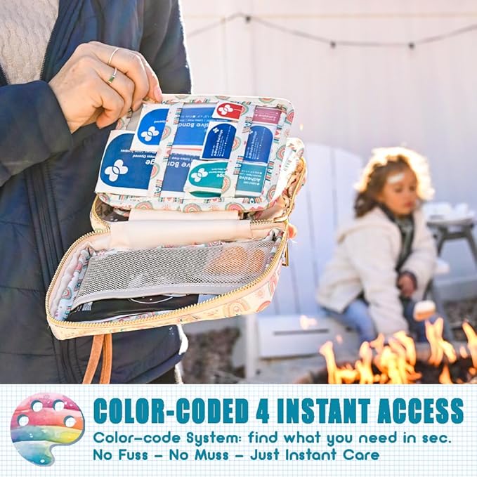 • ๐ŸŒˆ Travel-Friendly Organization: Our first aid kit is meticulously designed to ensure quick access during travel emergencies. Our supplies are neatly organized in designated compartments, all in one compact and portable storage bag, allowing for quick grabs during emergencies, making it perfect for parents on the go!