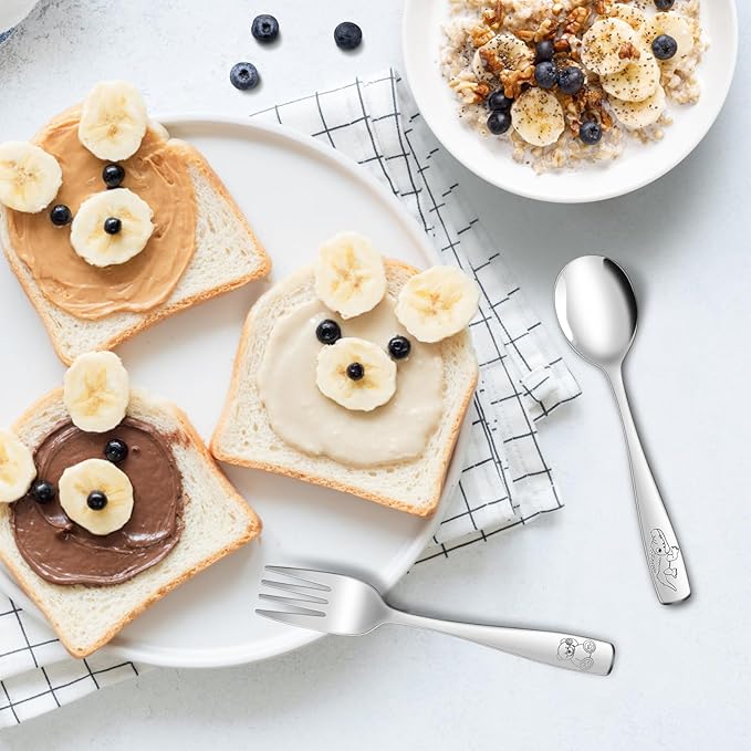 • PREMIUM STAINLESS STEEL KIDS HARDWARE: Great silver wear for kids, and great size for younger children and good quality. Made of high quality stainless steel that is completely safe and non-toxic for children's food, they will not rust or corrode. You donโ€™t have to worry about kids breaking them as they have other toddler utensils. Dishwasher cleans them fantastically.
