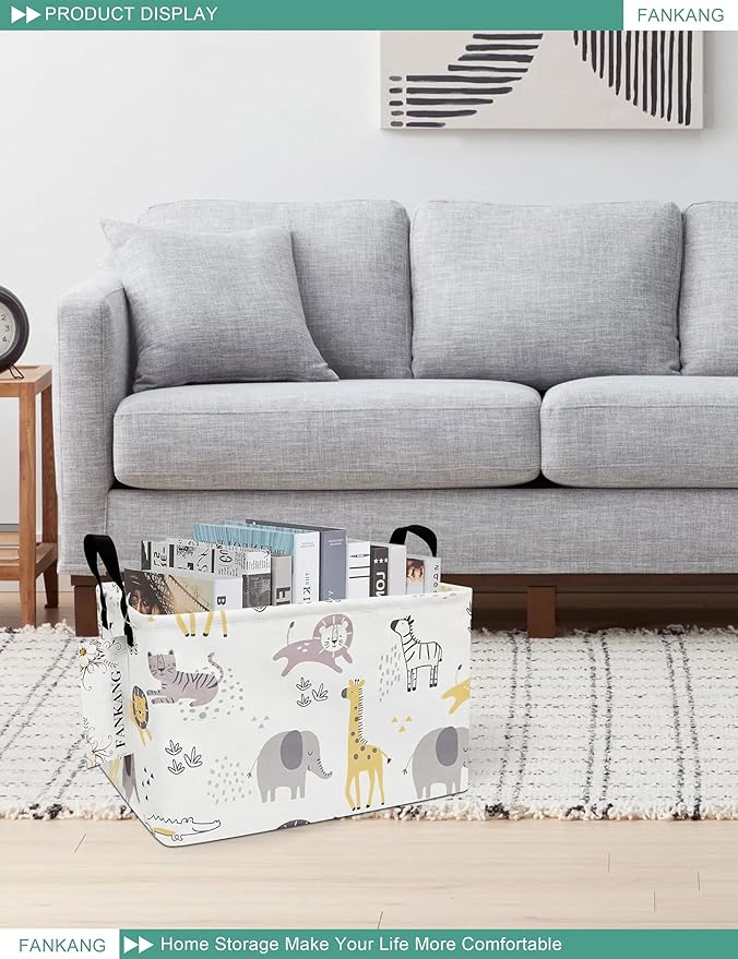FANKANG Storage Bins, Nursery Hamper Canvas Laundry Basket Foldable with Waterproof PE Coating Large Storage Baskets for Kids Boys and Girls, Office, Bedroom, Clothes,Toys(Rec-Lovely Animals )