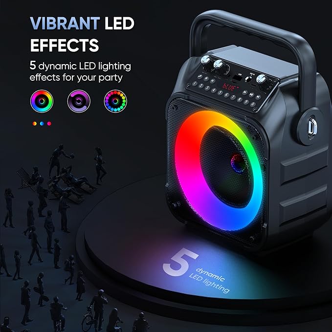 • TWS Mode and Brilliant Light Show: Bluetooth karaoke machine supports TWS function, which can realize the interconnection of two machines to form a dual-speaker karaoke system๏ผˆThe TWS function is only available for speakers, and microphone sound can only be emitted from the paired speakers๏ผ‰. Dual-channel surround for stunning stereo sound. Our karaoke machine's 5 dynamic color modes. Whether you're hosting a lively indoor party or enjoying a backyard barbecue, effortlessly switch between mesmerizing 5 light effects that create an enchanting atmosphere. Enhance every note and beat, transforming every gathering into a memorable event