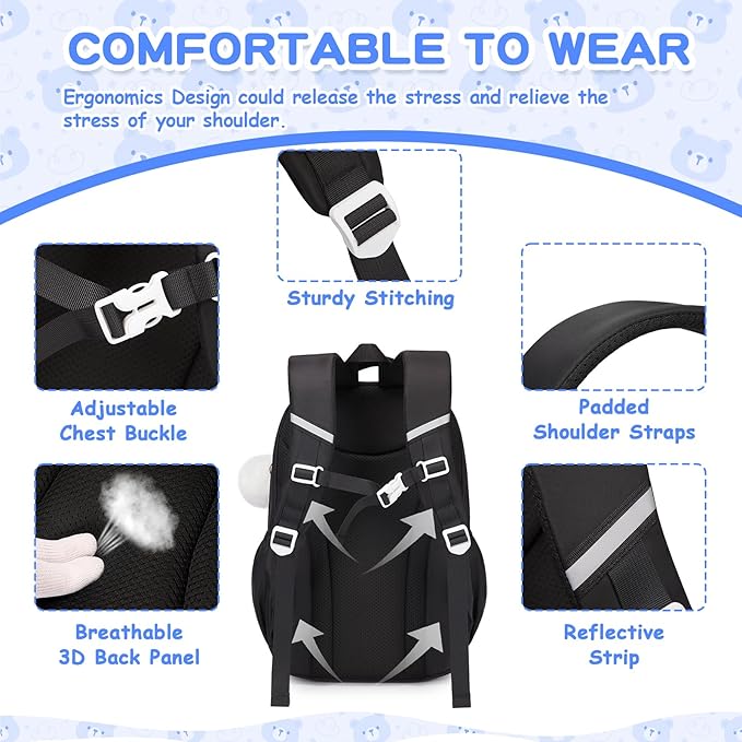 • Comfortable and Breathable: This girls boys school bag features ergonomical design, adopted with a breathable and thickened sponge of the padded shoulder strap and back panel, this cute backpack make the girls comfortable to wear, relaxing their shoulder and reducing pressure, the reflective strip on it could remind the passing vehicles to avoid