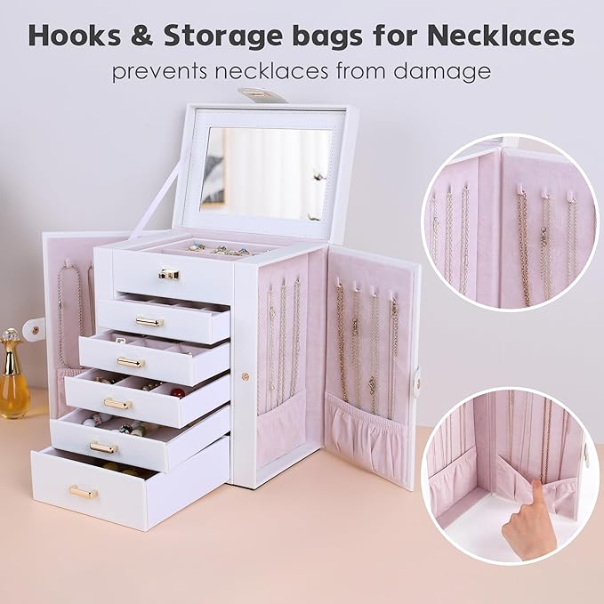 • Elegant Jewelry Organizer with Soft Pink Velvet Interior: Refine your jewelry storage with our beautifully crafted organizer, featuring a chic white exterior and plush pink velvet lining. Perfectly sized for essential pieces, it includes several drawers, side doors, and a top compartment with a mirror, suitable for organizing necklaces, earrings, bracelets, and rings.