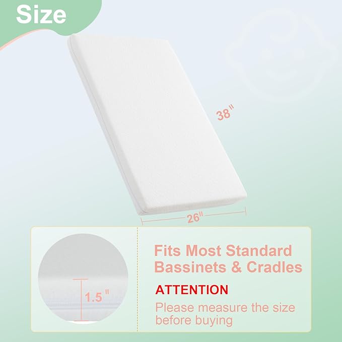 • Special Feature : 【Dual Side Firmness】The Pack and Play Mattress has dual firmness, it can provides support and comfort for babies at different stages of growth. The softer side is made of cooling gel memory form for growing toddlers, and firm side is made of high density support foam suitable for infant., 【Expand and Washing Instruction】Please wait 24-36 hours for the foam to expand after opening. Gently unzip the cover and machine wash on a low, delicate cycle, then air dry., 【Firmer Side for Infants】The firm side of our Pack and Play Mattress is made of high-density support foam for optimal firmness and ideal thickness. It won't collapse and provides enough support to prevent scoliosis and protect your baby's spinal development., 【Removable and Washable Cover】The bassinet mattress protector is made of 35% Tencel and 65% Polyester fabric. It has a zipper so you can easily remove the cover for machine washing to keep your mattress clean and fresh., 【Waterproof】Bassinet mattress cover is made of high quality TPU waterproof membrane that repels all other liquids, including fluids, perspiration, bed wetting, and stains. The waterproof feature protects the mattress. 【Dual Side Firmness】The Pack and Play Mattress has dual firmness, it can provides support and comfort… See more