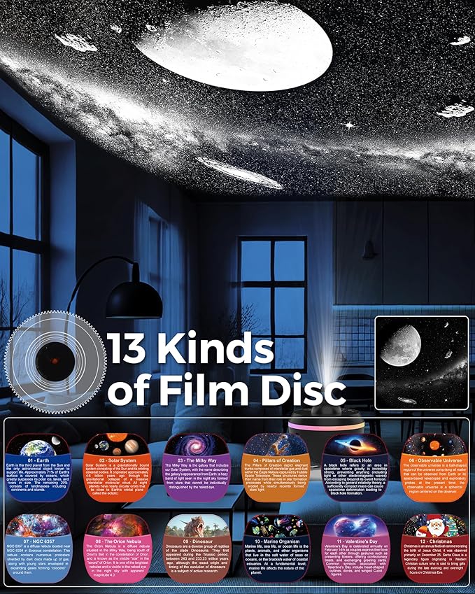• 【Upgraded 13 in 1 Galaxy Projector】Galaxy Projector for Bedroom come with 13 different conten film trays: 1-Earth, 2-Solar System, 3-The Milky Way, 4-Pillars of Creation, 5-Black Hole, 6-0bservable Universe, 7-NGC 6357, 8-The Orion Nebula, 9-Dinosaur, 10-Marine Organism, 11-Valentine's Day, 12-Christmas, 13-Moon(In-built).Kids will be mesmerized by the prehistoric giants, underwater creatures, solar system and the moon, sparking their imagination and curiosity. For special holidays, the Planetarium Projector casts romantic Valentine's scenes and festive Christmas images, creating a warm and joyful atmosphere.