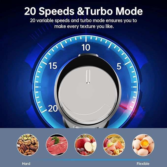 • 20-SPEED TO CREATE ANY TEXTURE YOU LIKE: In comparison to the 2-speed other brands offer, our hand mixer features 20 speeds( Low to high), giving you greater flexibility and maximum choice to prepare smoothies, baby foods, soups, shakes, and more. A separate Turbo Button is used to blast ice faster and better.