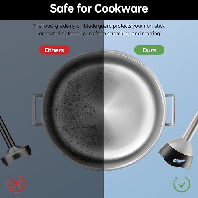 • NO MORE SCRATCHES ON YOUR CONTAINERS: Unlike other bargain brands, this hand blender has an upgraded blade guard to prevent scratches and marring on your pots, pans, and other containers. The unique bell-shaped guard also prevents splashing and ensures a spotless kitchen.