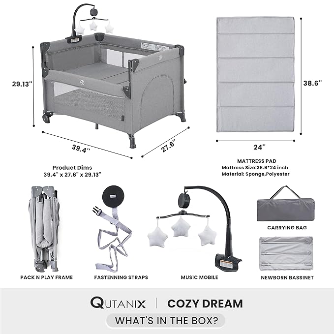 • VERSATILE 2-IN-1 BABY BASSINET & PACK AND PLAY - Starts on a parenting journey with Qutanix 2-in-1 Baby Bassinet & Pack n play Combo,it transforms from the intimate bedside bassinet sleeper to the versatile baby playpen and dual-functionality standalone baby crib - Qutanix Pack and play adapts seamlessly to every stage of your parenthood, ensuring your babyโ€™s safety and comfort at each stage.