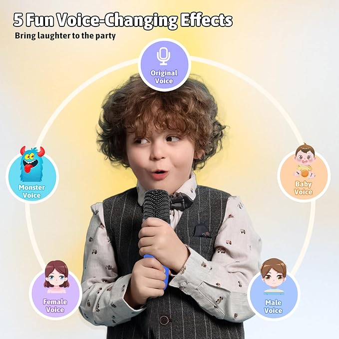 • Magic Voice and Dancing Lights: This microphone for kids transforms your voice with 5 amazing effects! It sounds like a man, woman, cute baby, scary monster! Kids will love creating adventures with different characters. Not only magic voice, but also it creates a dancing light show that pulses to the beat. It's a rainbow explosion of fun! It's the perfect way to add a touch of magic and excitement to playtime.Perfect for party entertainment