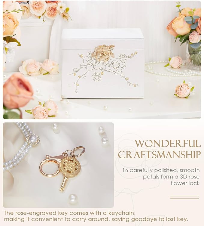 • Secure Storage with Elegant Leather: A jewelry box that locks, keeping your treasures secure with a rose lock and beautiful faux leather that adds a touch of luxury to any room.