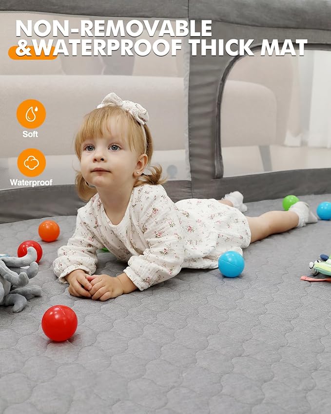 • Non-Removable Thick & Waterproof Mat:The playpen features a non-removable thick mat that provides a soft and comfortable surface for your baby; the waterproof material allows for easy cleanup of spills, making it ideal for both indoor and outdoor use