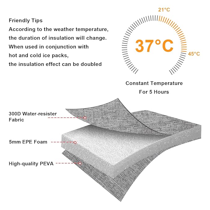 • HIGH QUALITY MATERIALS: This bottle cooler bag is made of high quality water-resistant 300D composite oxford fabric, 8mm extra-thick EPE foam and food-grade PEVA, non-toxic and food safe. Insulated lining can keep bottles cool or warm, it is a perfect breastmilk cooler tote bag for nursing mom.