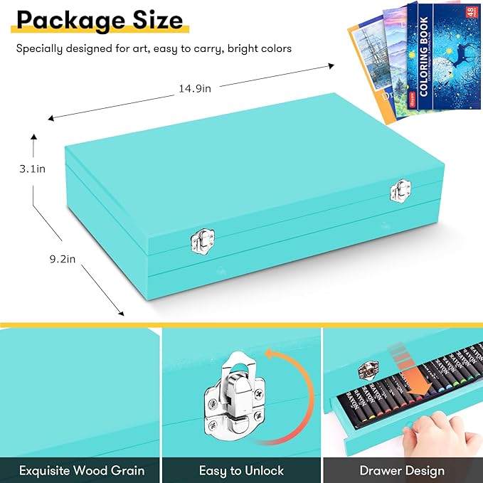 • 🎨【High Quality, Deluxe Art Kit】The Deluxe art case has everything you need to get started creating in a compact wooden case! You can begin drawing, coloring and painting as soon as you open the box. Specially designed with 2 big sketchbooks, 1 coloring book, 1 Gift Box. Great art set for any level of artist. This art case makes a great Gift for adults and kids, girls and boys, they are going to have so much fun!