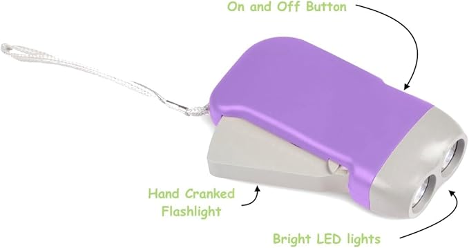 • 🦉FLASHLIGHT - with bright LED lights. Simple hand cranked function recharges in-built batteries so no additional batteries or charging required, the compact size and wrist strap make it perfect for camping, sleepovers and backyard nighttime adventures.