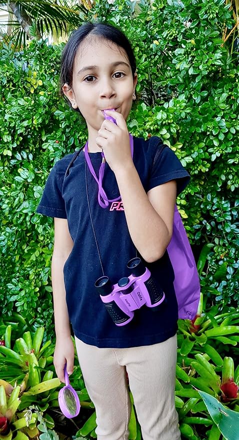 • 🔍LARGE MAGNIFYING GLASS - 3 x magnification for examining plants, insects and rocks. Wonderfully fun for camping trips and outdoor or indoor investigations. SAFE Non Choking pealess FOX WHISTLE - great for hiking, scouting, sports, games and safety locator. Clip on thick lanyard to be worn around the neck for quick access for signaling location or emergency use.