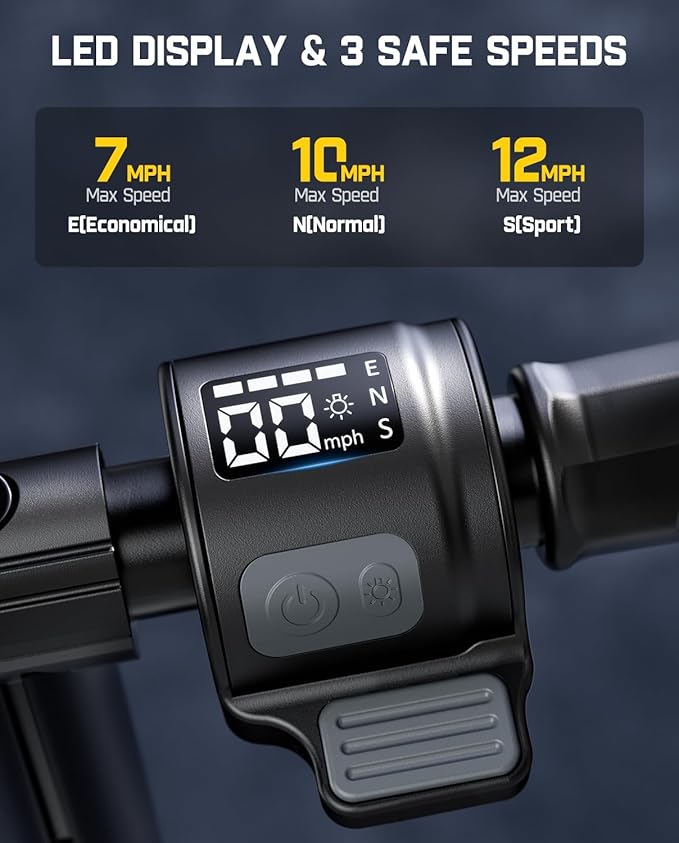 • Three-speed modes: This scooter offers three user-selectable speed modes (E, N, S) . The E gear provides with a speed limit of 7MPH; the N gear offers with a speed limit of 10MPH, and the S gear , boasting speed of 12MPH