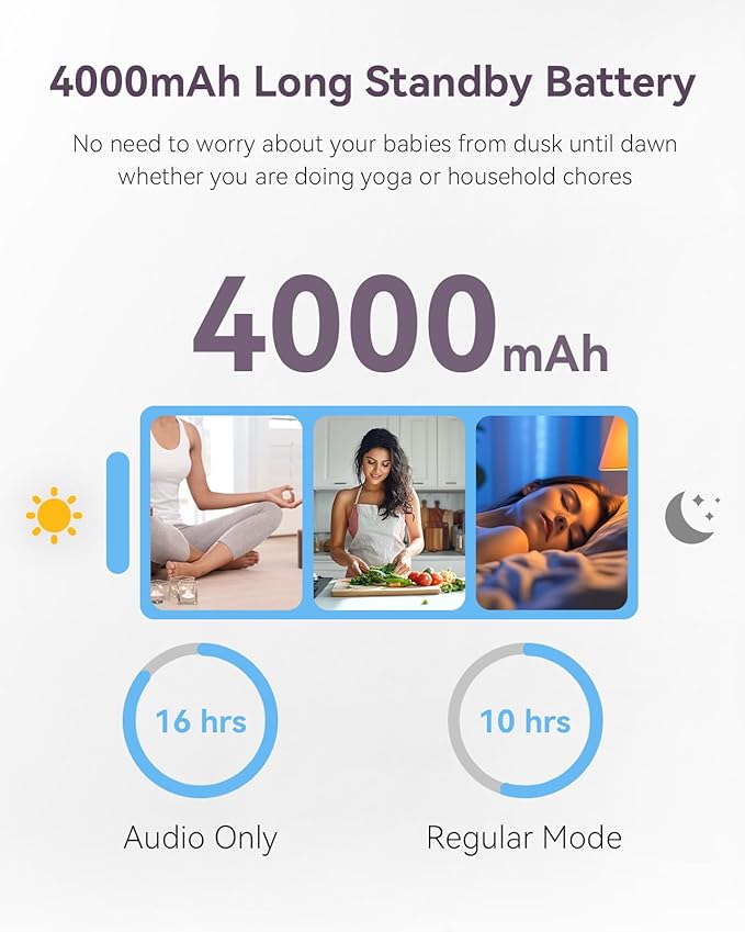 • 【Up to 10 Hrs. Regular mode or 16 Hrs Vox mode on Single Charge】: With 4000mAh rechargeable battery you can get up to 10 hours of video streaming or up to 16 Hrs of Audio only, allowing you to easily monitor your baby throughout the night or full day on one charge.
