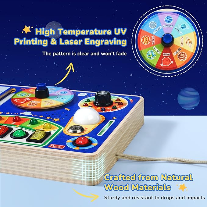 • Interactive Wooden Switch Board: Designed for toddlers who love switches and LED lights, this toddler busy board features different switches, each linked to a unique LED. The brightness is perfectly adjusted to be comfortable for young eyes, not too bright or dim
