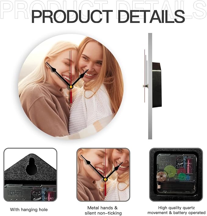 • 【Personalized pictures clocks】Please click the“customize now“button at upper,upload your customized photo and add text.Stretch photo to fill the entire printing area.Submit high definition images for better print results.