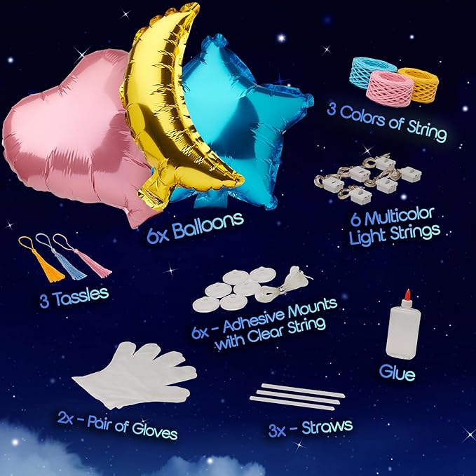• All-Inclusive DIY Craft Set – Includes 6 balloon shapes (2 each: heart, moon, star), 3 vibrant string colors, 3 tassel colors, 6 mini LED lights, glue, gloves & mounting accessories. Everything your child needs to build glowing 3D art!